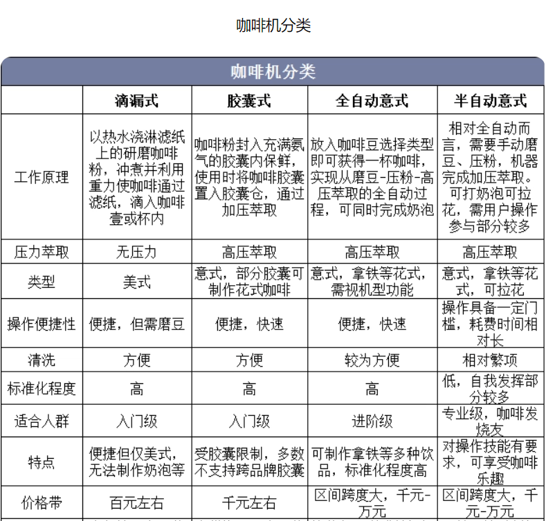 人們把電子技術應用到咖啡機上,實現了磨粉、壓粉、裝粉、沖泡、清除等釀制咖啡全過程的自動控制,創造了咖啡機。具體分品類來看,咖啡機根據萃取方式可主要分為滴漏式、膠囊式和壓力式(意式),根據工作方式可分為全自動和半自動(區別在于半自動需要消費者掌握一定的咖啡技能,磨豆、壓粉、打奶泡等多項步驟需手動參與)。