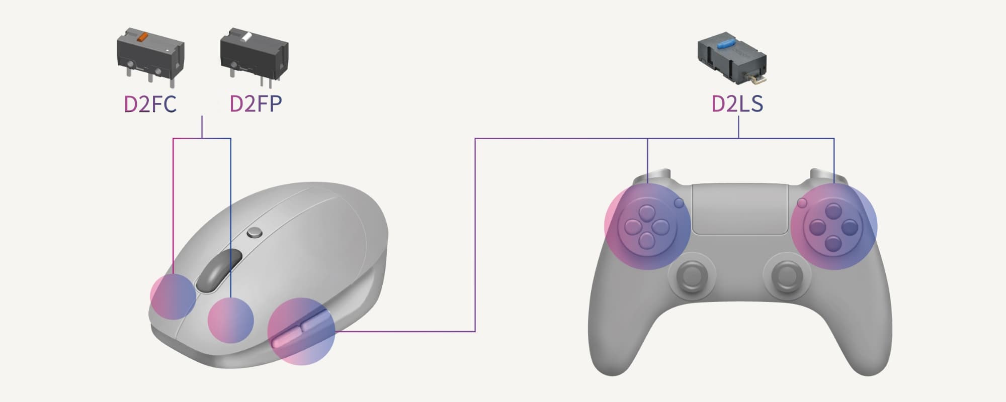 微動開關(guān)是具有微小接點間隔和速動機構(gòu),用規(guī)定的行程和力度進(jìn)行開關(guān)動作的一種微小型開關(guān)。在最開始,歐姆龍并沒有生產(chǎn)鼠標(biāo)專用微動開關(guān)的想法,而契機來源于一家鼠標(biāo)廠商,他們非常喜歡歐姆龍微動開關(guān)D2F系列的操作感和輕觸感,作為日常使用頻率極高的的鼠標(biāo),具有“后行程”功能的D2F型可從推入位置繼續(xù)推入,對手指產(chǎn)生的負(fù)擔(dān)微小。于是便于手指操作且尺寸較小的D2F系列開關(guān)正巧成為了一款可滿足鼠標(biāo)開關(guān)需求的商品。