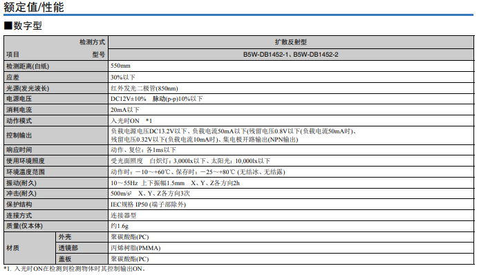 歐姆龍光電傳感器B5W-DB的光源為紅外發光二極管(850nm),受光面照度在白熾燈的情況下為3,000lx以下、太陽光的照度下為10,000lx以下。不僅如此,B5W-DB的外殼采用聚碳酸酯(PC)、透鏡部采用丙烯樹脂(PMMA)、蓋板采用聚碳酸酯(PC)材質,保護結構符合IEC規格IP50標準(端子部除外),可幫助設備實現強耐用性。