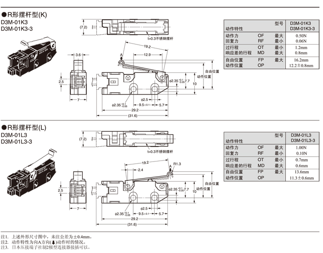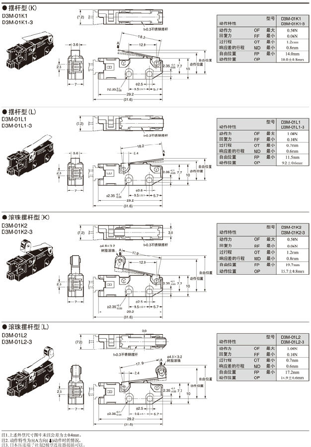 在針狀按鈕型中為了自由位置和總行程位置的數(shù)據(jù),在擺桿型中為總行程位置的數(shù)據(jù)。 接點(diǎn)的閉路或開路在1ms以內(nèi)。 |