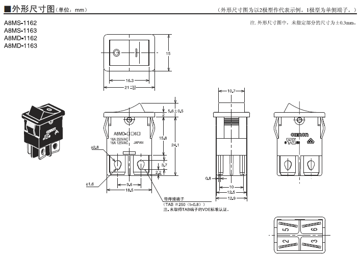 實現16A開關性能的小型船形開關 小型、16A的開關性能。 可進行一觸式安裝。 符合UL、cUL認證,EN標準適用品。