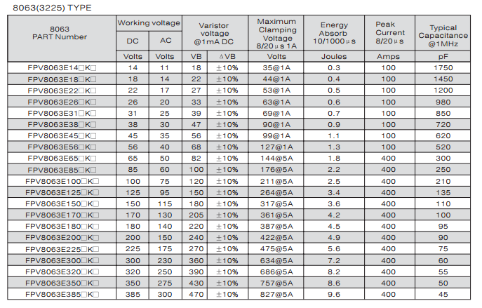 特征: 1、疊層片式陶瓷結構。 2、無引線。 3、溫度范圍:-55℃~+125 ℃。 4、工作電壓范圍V w(dc)=3.3~ 615V。 5、具有雙向限制特性,適合ESD保護。 6、漏電流非常小。 7、寄生電感小、響應速度快(響應時間少于0.5ns)。 8、優良的溫度系數。 9、良好的焊接性能(端電極為三層電鍍)。 應用: 1、防止過電壓:當施加的電壓升高到壓敏電壓時,壓敏電阻器的電流急劇上升,被保護設備的浪涌電壓迅速減小,從而使裝有壓敏電阻器的設備抗浪涌噪聲能力達到相應要求。